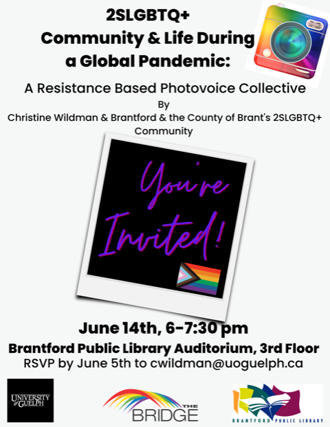In partnership with The Bridge Brant and many members of local 2SLGBTQ+ communities, Christine Wildman conducted a tremendous volume of research in the successful pursuit of her post-graduate degree. Come see some of her findings in visual form – a resistance based photovoice collective exploring community and life during a global pandemic.